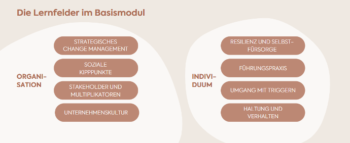 Durch das Basisseminar, das gezielt auf ihre Bedürfnisse zugeschnitten ist, erhalten sie einen Werkzeugkasten, um die Grundprinzipien des Veränderungs- und Transformationsmanagements zu verstehen und ihre Methodenkompetenz in Kommunikation und Umgang mit Widerständen zu stärken. Das Ziel der Ausbildung ist es, das Transformationswissen anhand konkreter Praxisbeispiele der Teilnehmenden zu vermitteln und anzuwenden, um einen effektiven Lerntransfer zu gewährleisten. In den Aufbaumodulen werden einzelne Themen vertieft.
