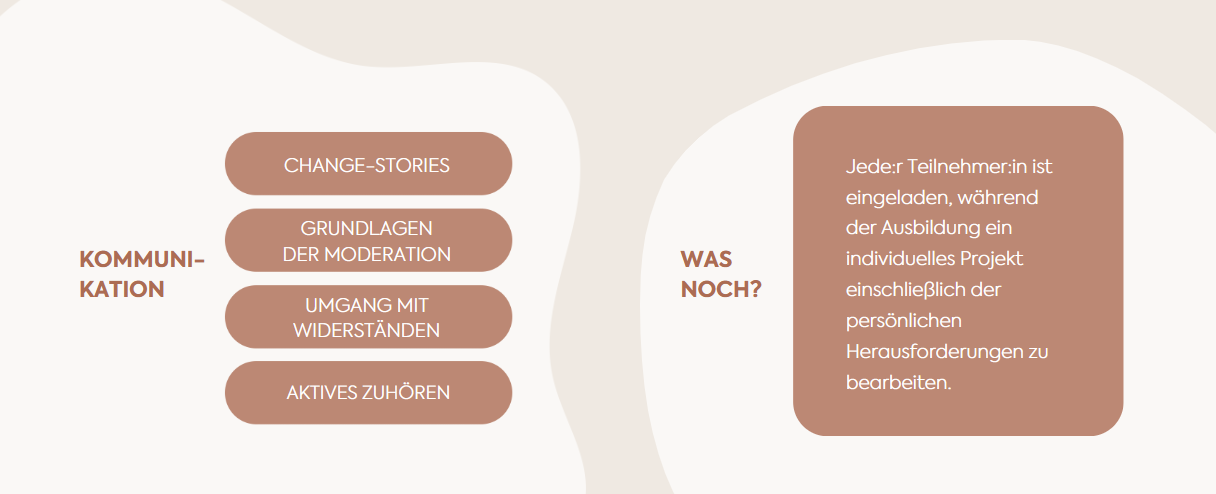 Wir finden, das darf nicht sein. Wie können wir ihnen den Rücken stärken? In dieser Ausbildung wollen wir sie mit dem notwendigen Handwerkszeug zu Change und Transformation ausstatten.